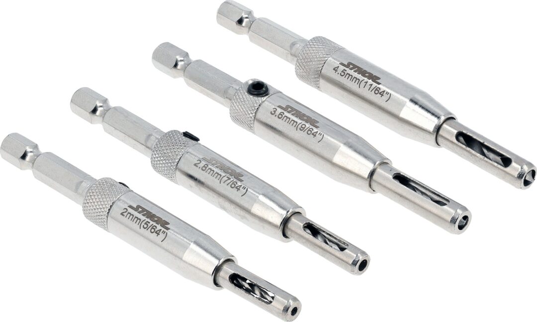 4 vnt. savaime centruojančių grąžtų rinkinys, skirtas medienai, plastikui ir minkštiems metalams. Šis aukštos kokybės įrankių rinkinys puikiai tinka tvirtinimo skylių gręžimui baldų konstrukcijose ir vyriams. Specialus savaime centruojantis kreiptuvas užtikrina itin tikslų gręžimo krypties palaikymą, leidžiant pasiekti preciziškus ir profesionalius rezultatus. Pagamintas iš patvaraus ir atsparaus #45 anglinio plieno, paviršius padengtas nikeliu, kuris suteikia papildomą apsaugą nuo korozijos. Įrankių laikiklis – šešiakampis, dydis 1/4 colio (6,3 mm), todėl lengvai tvirtinamas prie įvairių gręžimo įrankių. Automatinis pjuvenų ištraukimas per viršutines skyles padeda išvengti gręžimo įstrigimo. Rinkinį sudaro keturi skirtingų skersmenų grąžtai: 2 mm (tinka varžtams 2,2–2,8 mm), 2,8 mm (3–3,5 mm), 3,6 mm (4–4,5 mm) ir 4,5 mm (5–5,5 mm), leidžiantys pasirinkti optimalų dydį konkretiems darbams.