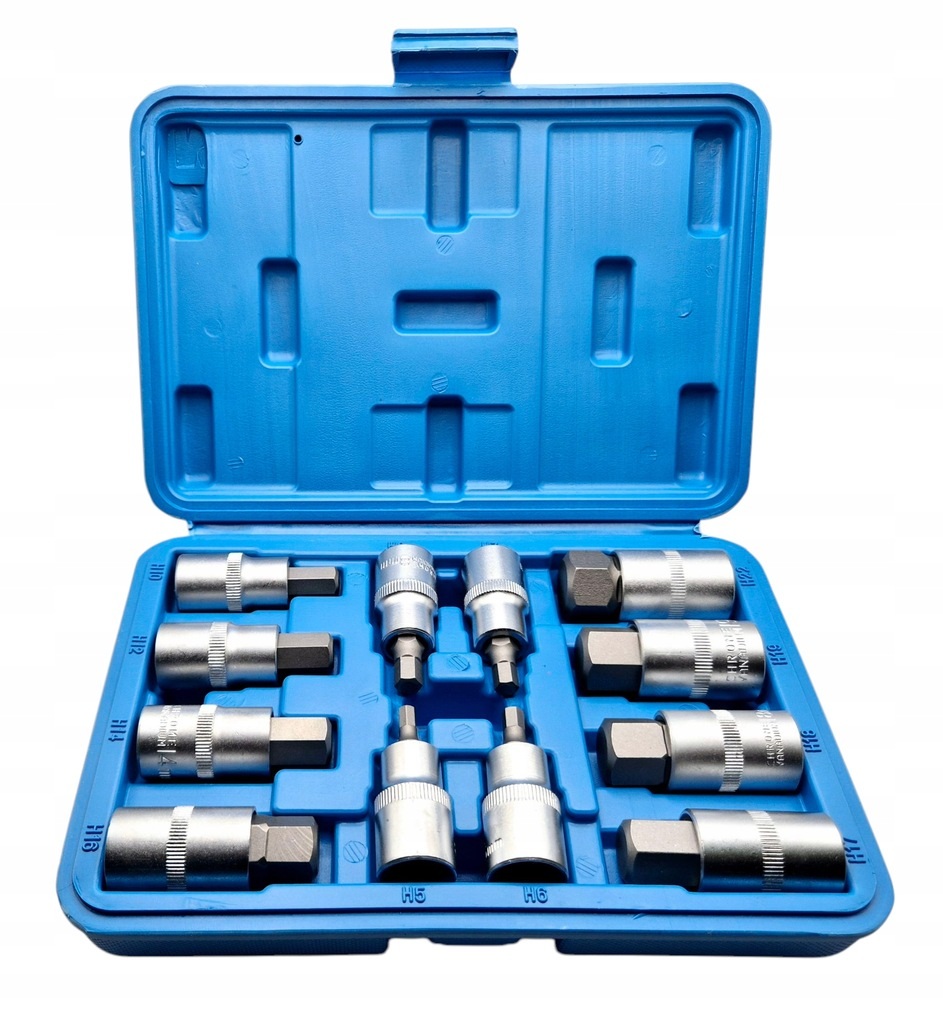 Įpresuotų HEX antgalių rinkinys H5–H22, 12 vienetų, skirtas profesionaliems ir namų automobilių remonto darbams. Komplekte rasite patogiai supakuotus antgalius, kurių ilgis 55 mm, o dydžiai nuo H5 iki H22, įskaitant H6, H7, H8, H10, H12, H14, H16, H17, H18, H19. Rinkinys yra supakuotas tvirtame plastikiniame dėkle, užtikrinančiame patogų saugojimą ir transportavimą.