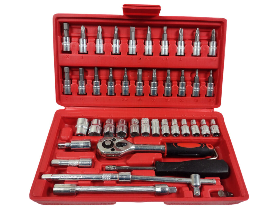 Galvučių su terkšle rinkinys 1/4″, 46 vnt. – patikimas, pilnas įrankių komplektas, užtikrinantis darbo kokybę ir komfortą.