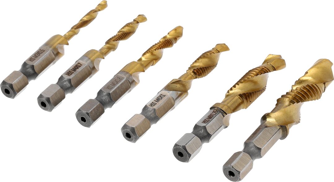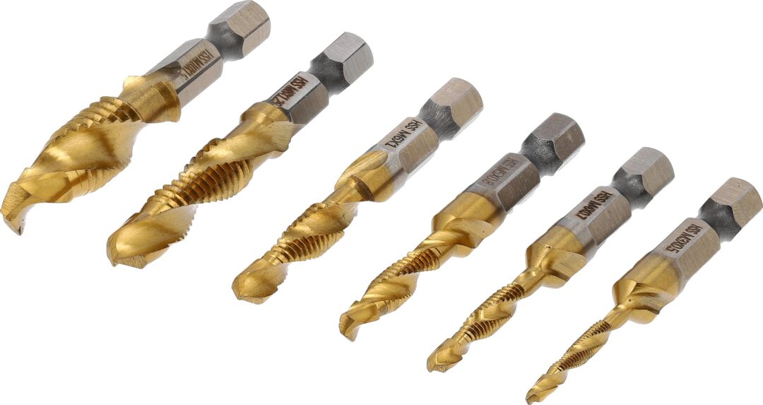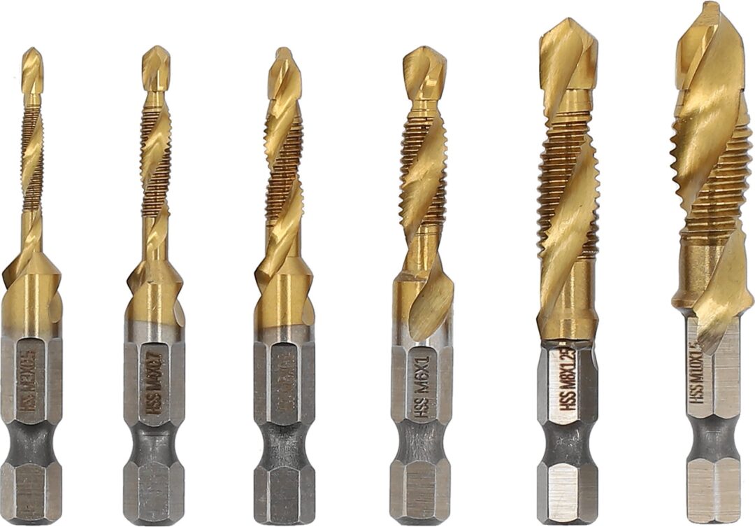 Paviršius padengtas titano nitrido sluoksniu, kuris dar labiau padidina įrankių kietumą, atsparumą karščiui ir korozijai, sumažina trintį, leidžiant dar geriau atlikti darbus ir pratęsti įrankių tarnavimo laiką. Komplekte yra šeši skirtingų dydžių grąžtai ir sriegikliai: M3 x 0,5 mm, M4 x 0,7 mm, M5 x 0,8 mm, M6 x 1 mm, M8 x 1,25 mm ir M10 x 1,5 mm – visi su 1/4 colio (6,3 mm) šešiakampiu laikikliu.